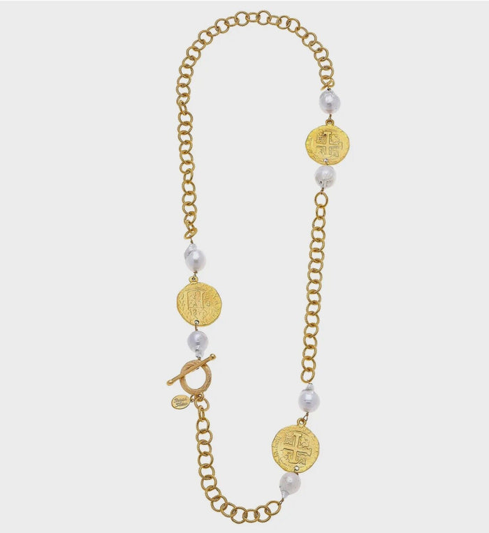 Susan Shaw Cross Coin + Pearl Toggle 30” Necklace